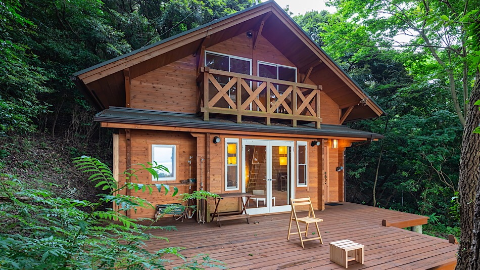 東京湾を望む高台に建つログハウスで、天気がよければ夕日と富士山を望むことができます。BBQ可能。
