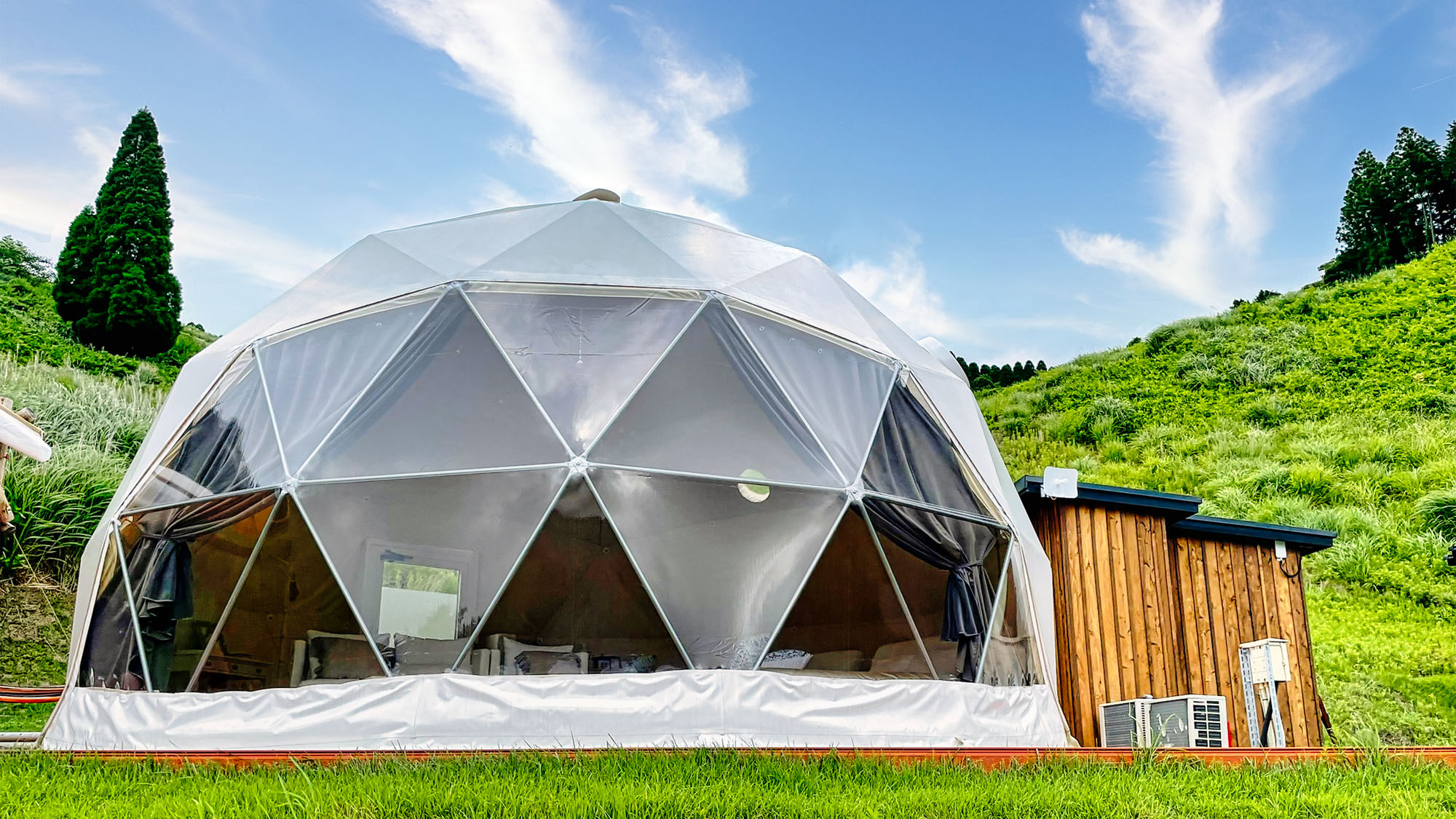 9000坪の広大な敷地にドーム型テントを備えたグランピング施設で最高の休日をお楽しみください