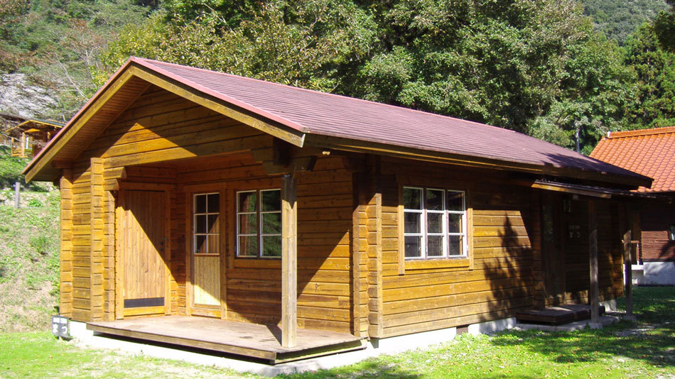 澄み切った空気に清流、深い緑と静寂に包まれた、自然豊かなキャンプ場内の山小屋。キッチン、シャワー完備